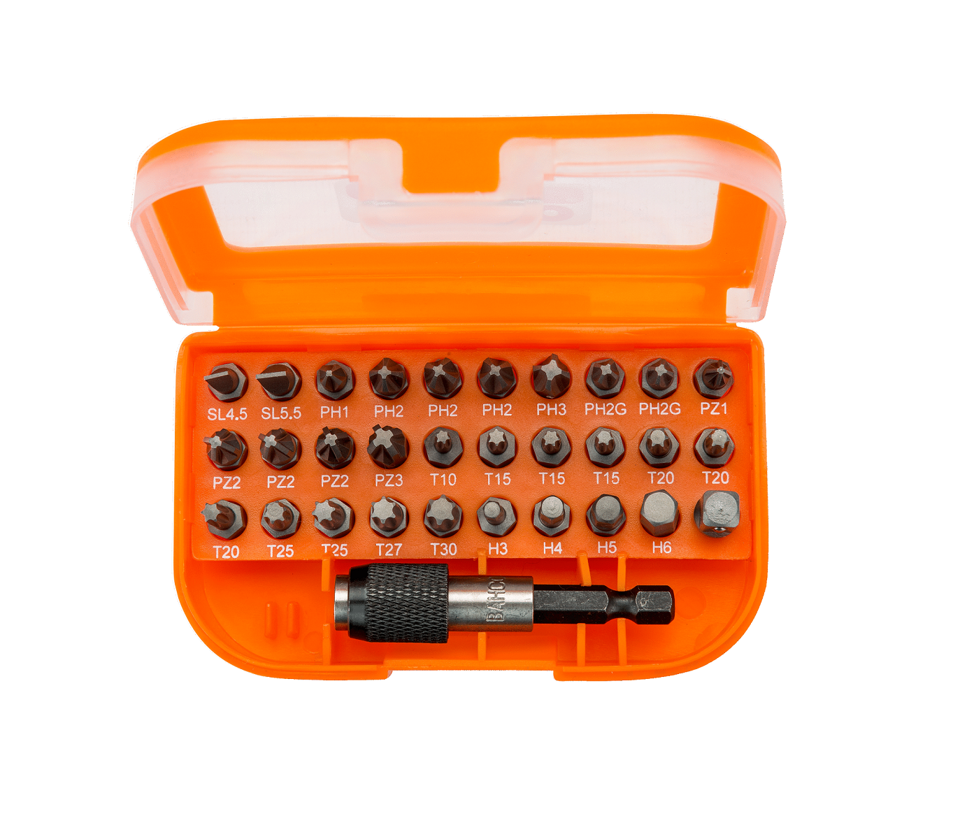 Innehåller 31 delar: 29 bits, en magnetisk bitshållare med snabblossning och en hylsadapter.