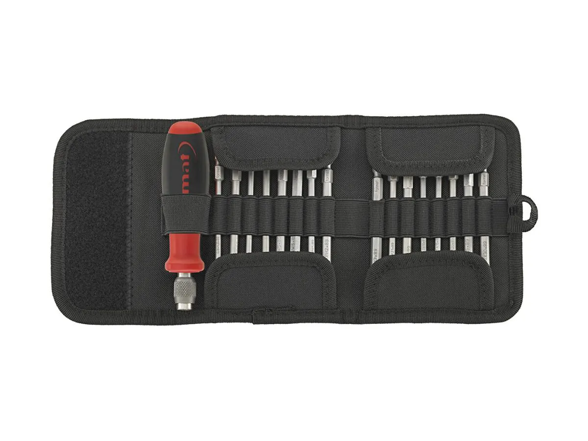 Set Innehåll:1 multifunktionshandtag med snabbväxling2 bitars slits 4,0 x 0,8; 5,5 x 1 mm 3 bitar Phillips PH 1; 2; 3 2 bitars korslucka PZ 1; 2 4 bitars hexagonuttag 3; 4; 5; 6 mm 5 bitars inre TORX® T 10; 15; 20; 25; 30 särdrag Format: 17 del