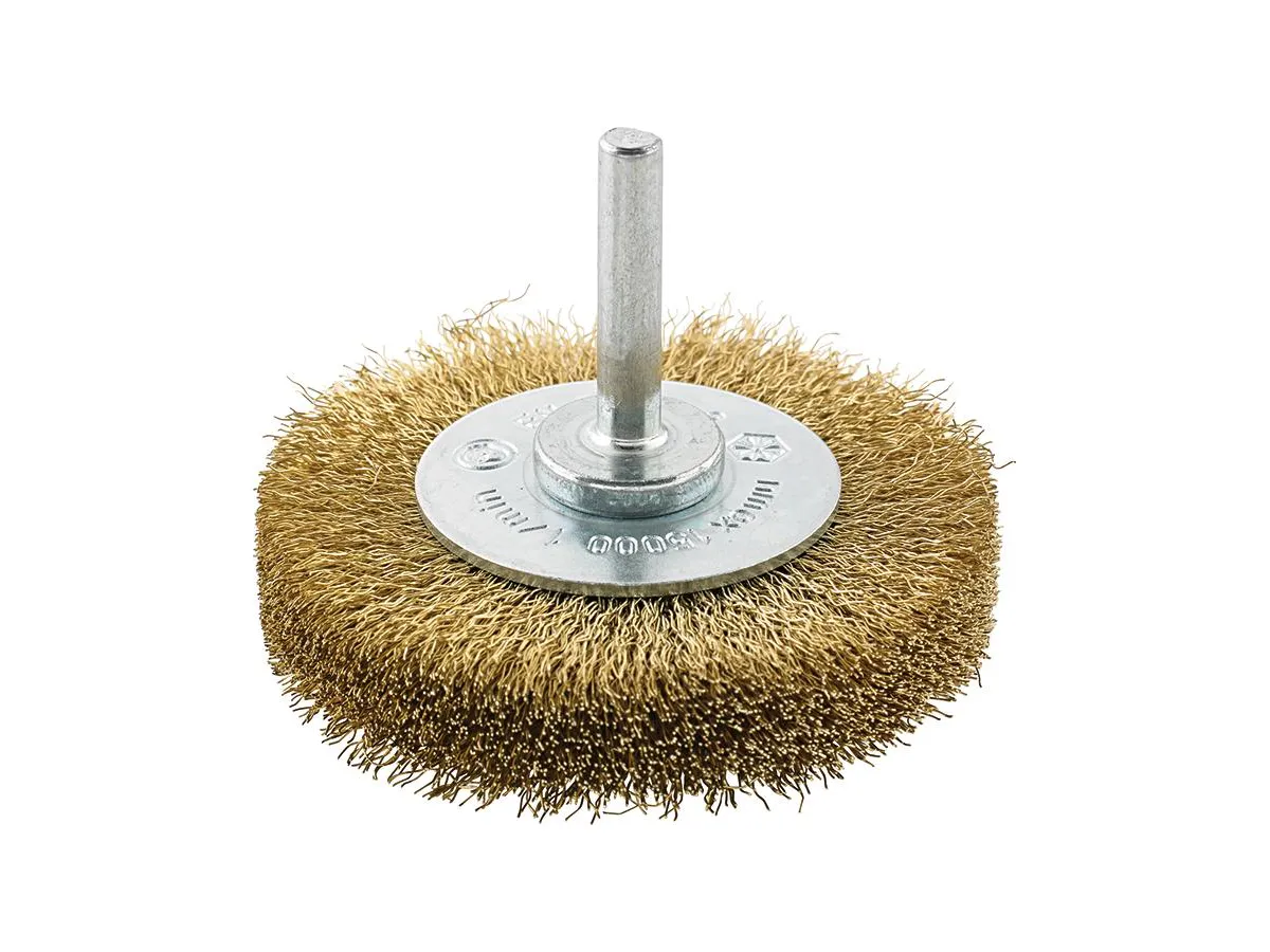 Cirkulärborste med vågigt mässingstråd och 6 mm skaft – idealisk för skonsam rengöring av mjukare material utan repor, samt för borttagning av färg, rost och grader.