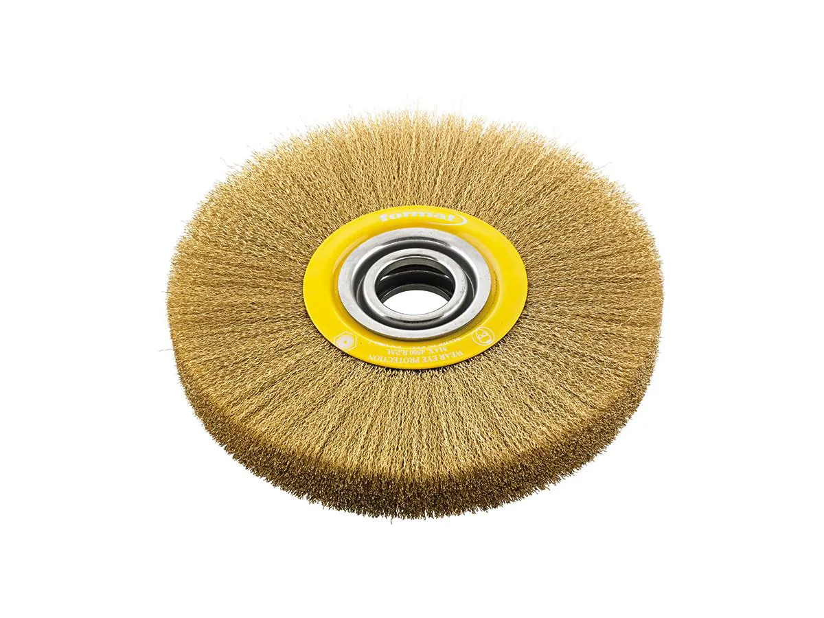 Effektiv cirkulärborste med vågig mässingstråd för grovrengöring, gradning och rengöring av större ytor i stationära maskiner.