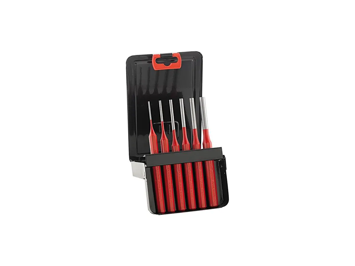 Pin-drivrutin i plåtkassettDesign: DIN 6450 D, tillverkad av ottekantigt krom-molybden-vanadin lufthärdande stål, cylindrisk dornform. Med härdat slårhuvud, sålunda vulstformning, Umbördelungen och chipping är nästan omöjliga. Mask och axel härdad, härdad och målad. funktioner: utförande: 6 delar Set Innehåll: 2; 3; 4; 5; 6; 8 mm