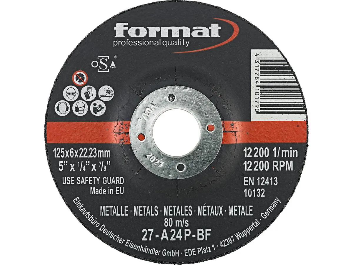 Utförande: Kraftfull slipskiva av aluminiumoxid (A24) med hård, fiberförstärkt hartsbindning som ger hög avverkningseffekt, lång livslängd och stabil gång. Standardhål 22,23 mm.