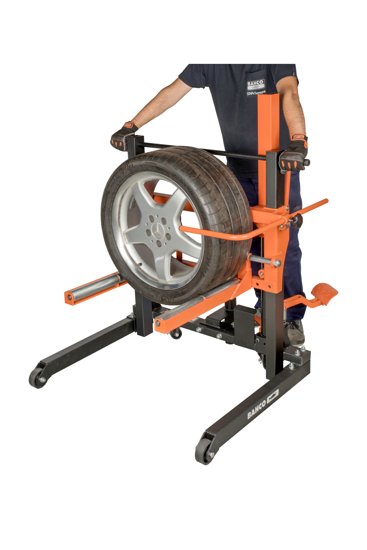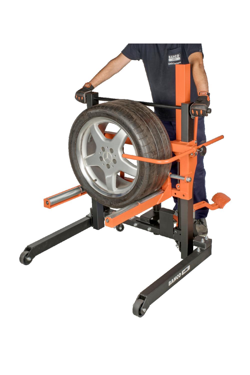 - - Bakre hjul med broms för att fixera hjulvagnen och förhindra rörelser under däckbytet.