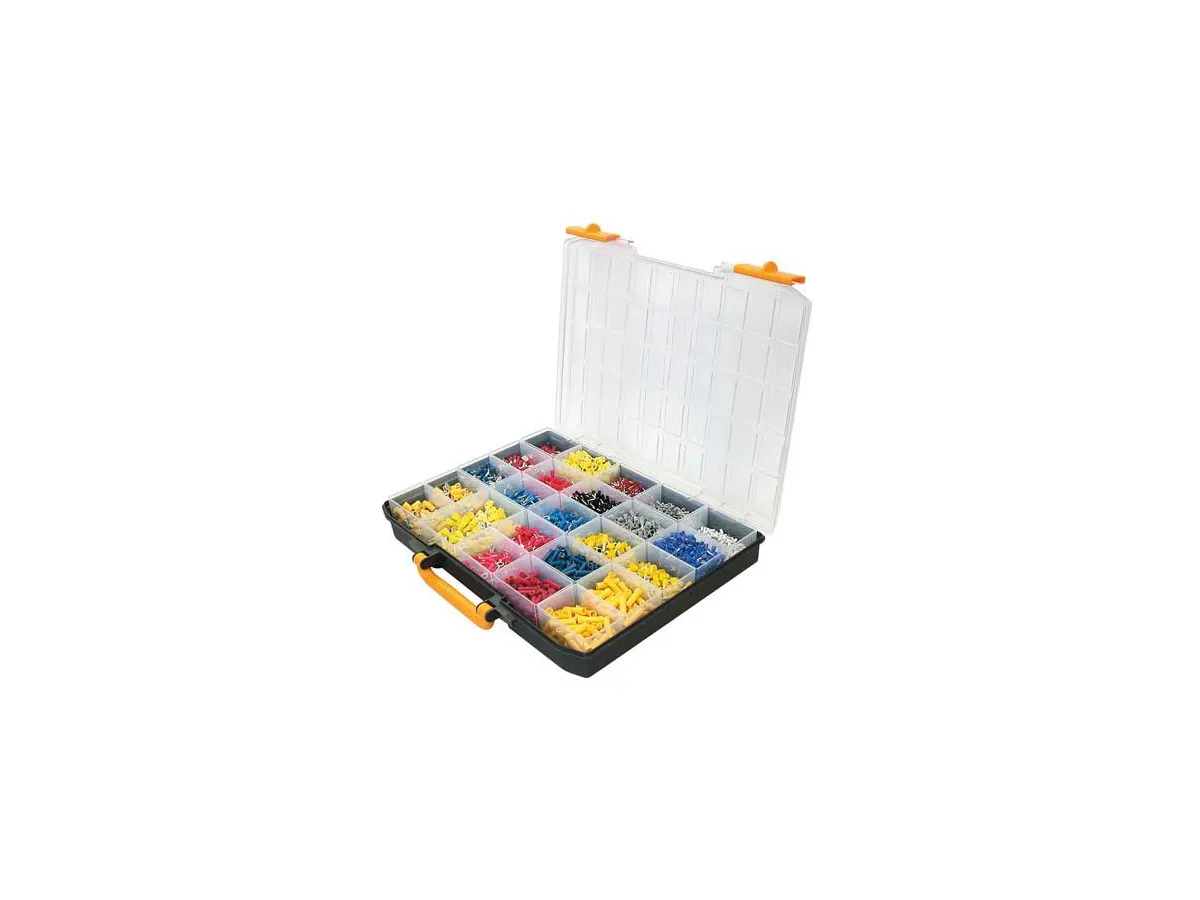 Kabelsko / kabelanslutningssortiment, 4400 delar, FORMATUtförande: Isolerade ring- och stiftkablar, skaftanslutningar och bladuttag, ledarens tvärsnitt på 0,5-6 mm². Levereras i plastfodral med avtagbara skär. Set Innehåll: 250 ändhylsor 4 vardera; 6 mm² 500 hylshylsor 0,5 vardera; 0,75; 1; 1,5; 2,5 mm² 100 ringkabelkroppar 0,5-1,5 (M4) vardera; 0,5-1,5 (M5); 1,5-2,5; 4,0-6,0 mm² 100-poliga kabelskoar 0,5-1,5 vardera; 1,5-2,5; 4,0-6,0 mm² vardera 100 rakt-anslutningar 0,5-1,5; 1,5-2,5; 4,0-6,0 mm² 100 flikar 0,5-1,5 (2,8 mm) vardera; 0,5-1,5 (6,3 mm); 1,5-2,5; 4,0-6,0 mm²
