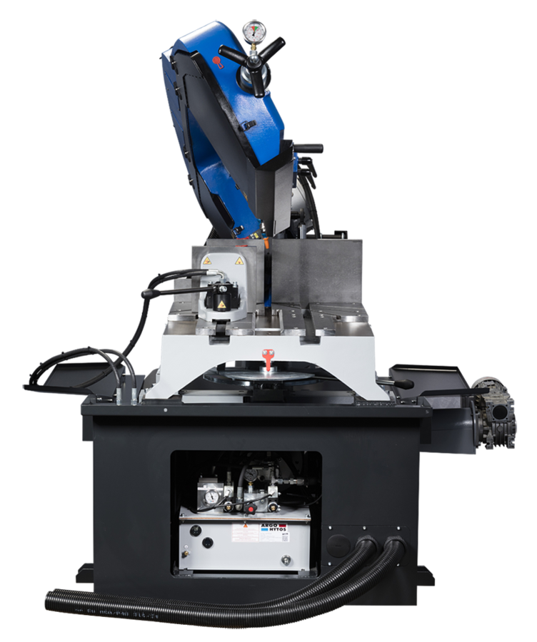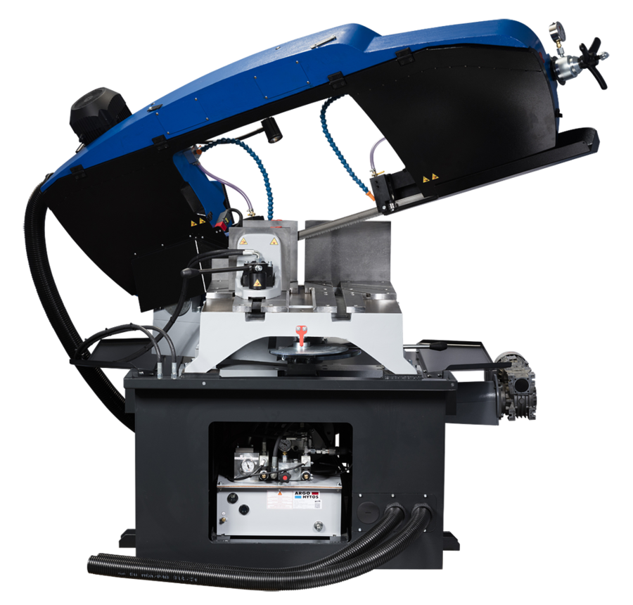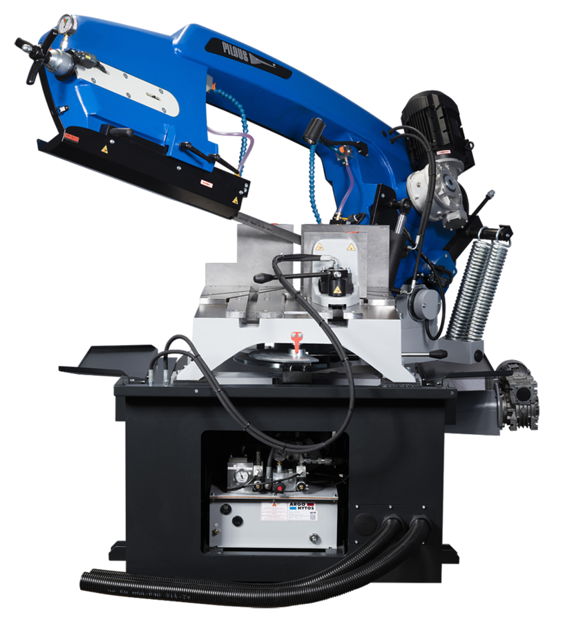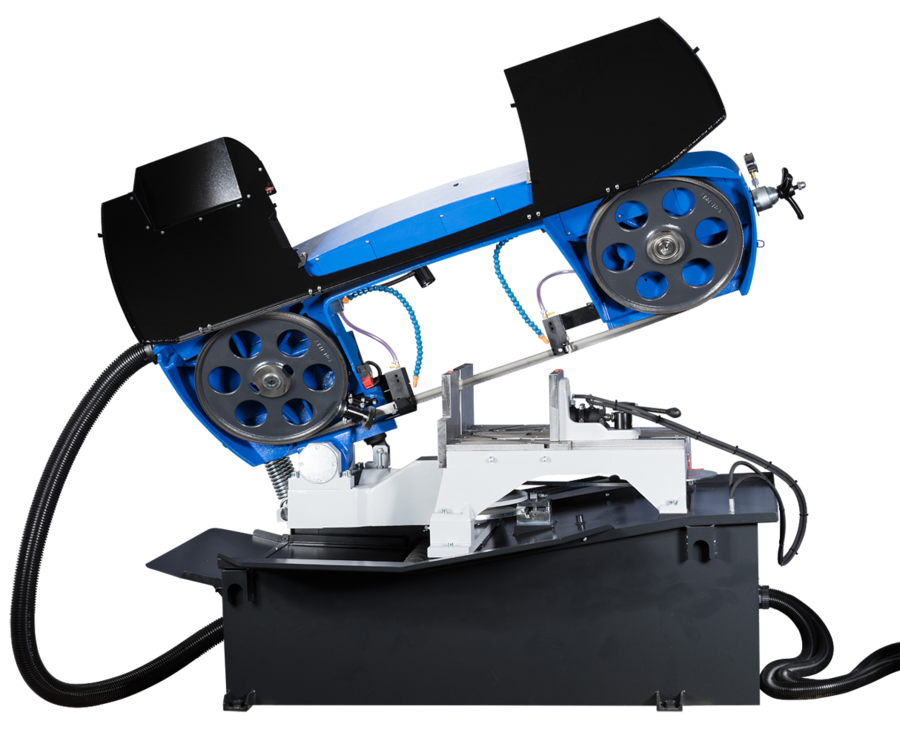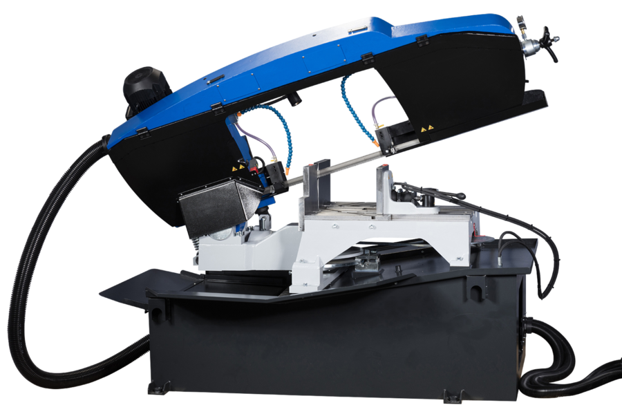 - Den halvautomatiska versionen levereras med hydrauliskt skruvstycke och har steglös reglering av bandhastighet (15–90 m/min).