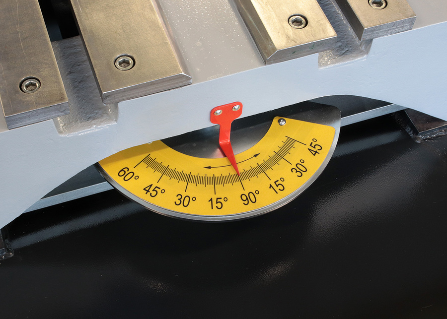 - Sågbygeln kan enkelt ställas in för gering (från 45° vänster till 60° höger) från maskinens manöverpanel (bygeln låser fast mekaniskt i läge).