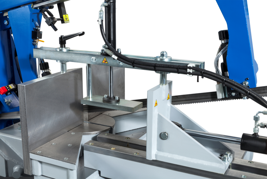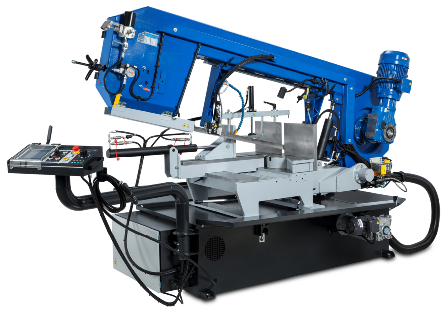 - Den halvautomatiska versionen levereras med hydrauliskt skruvstycke och har steglös reglering av bandhastighet (15–90 m/min).