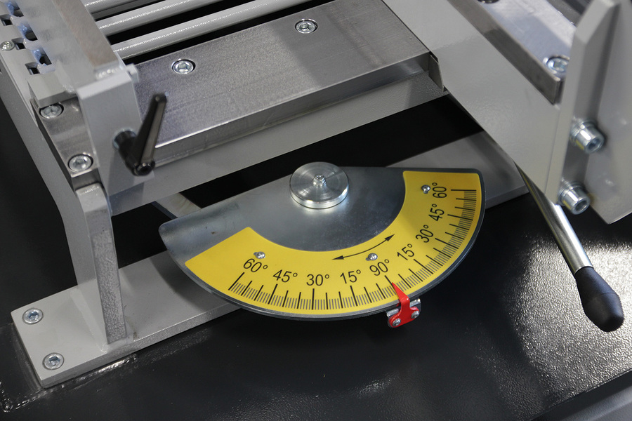 - Sågbygeln kan enkelt ställas in för gering (från 45° vänster till 60° höger) från maskinens manöverpanel (bygeln låser fast mekaniskt i läge).