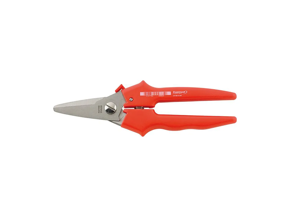 Mångsidig kombisax i rostfritt stål med plastbelagda handtag – ger rena, kontrollerade snitt i allt från papper till plåt och läder.