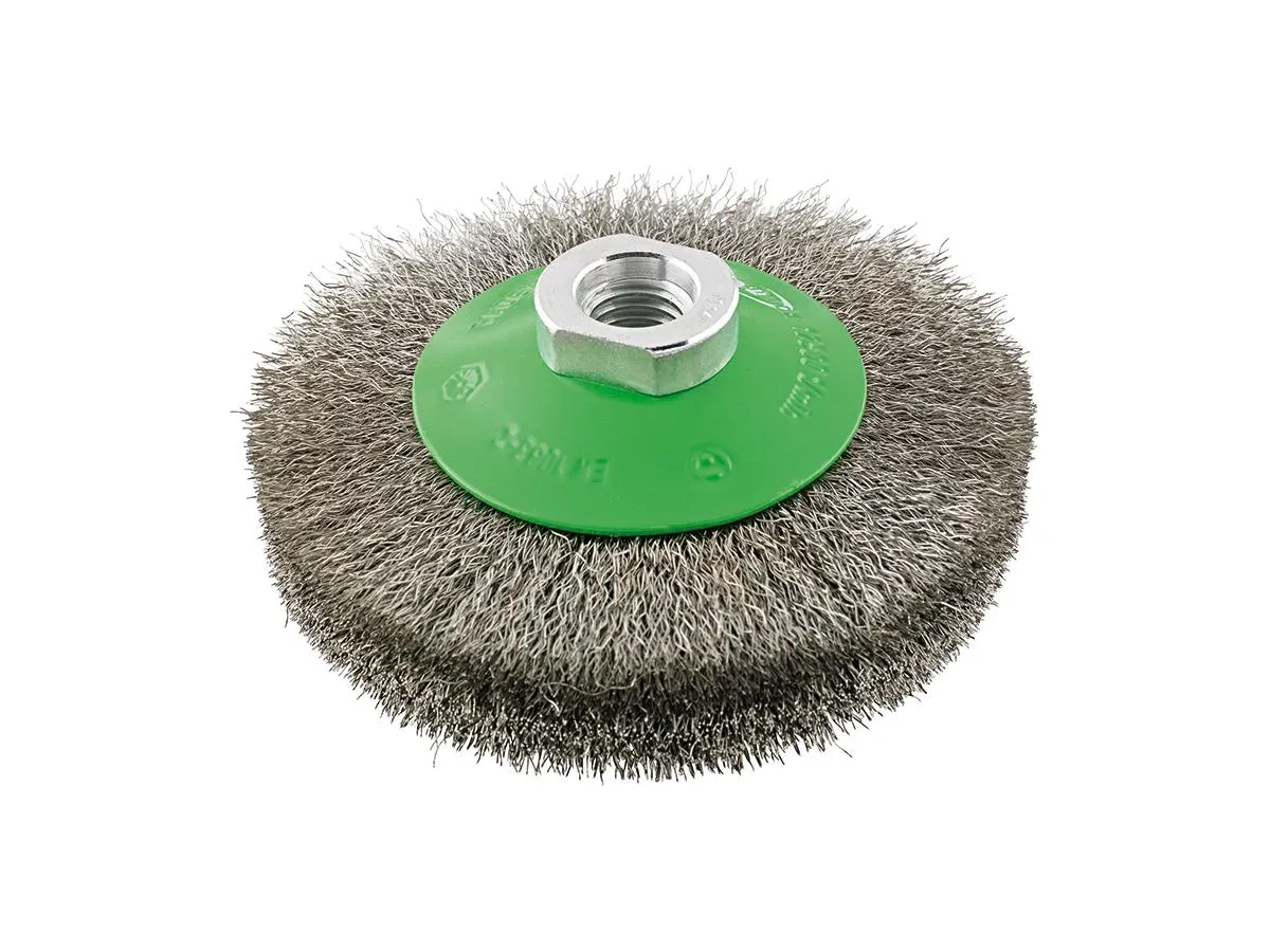 Konisk stålborste med vågigt rostfritt ståltråd (1.4310) och M14-gänga för effektiv rengöring, uppruggning och borttagning av färg, rost och grader även på svåråtkomliga ytor.