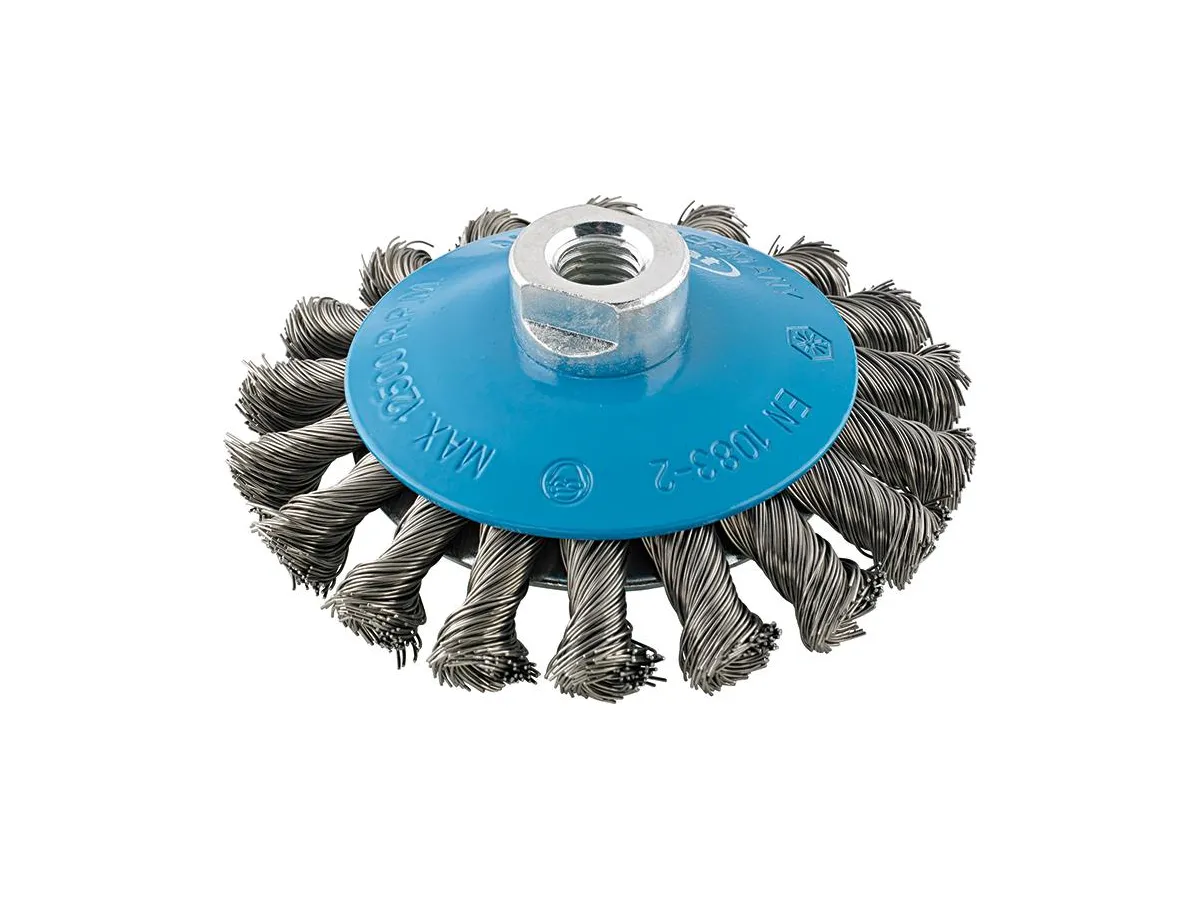 Konisk stålborste med virad ståltråd och M14-gänga för effektiv rengöring, uppruggning och borttagning av färg, rost och grader även på svåråtkomliga ytor.
