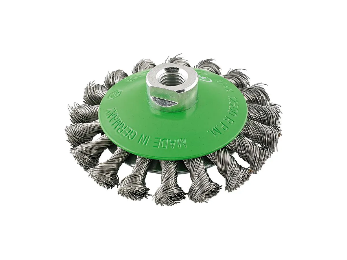 Konisk stålborste med virad rostfritt ståltråd (1.4310) och M14-gänga för effektiv rengöring, uppruggning och borttagning av färg, rost och grader även på svåråtkomliga ytor.