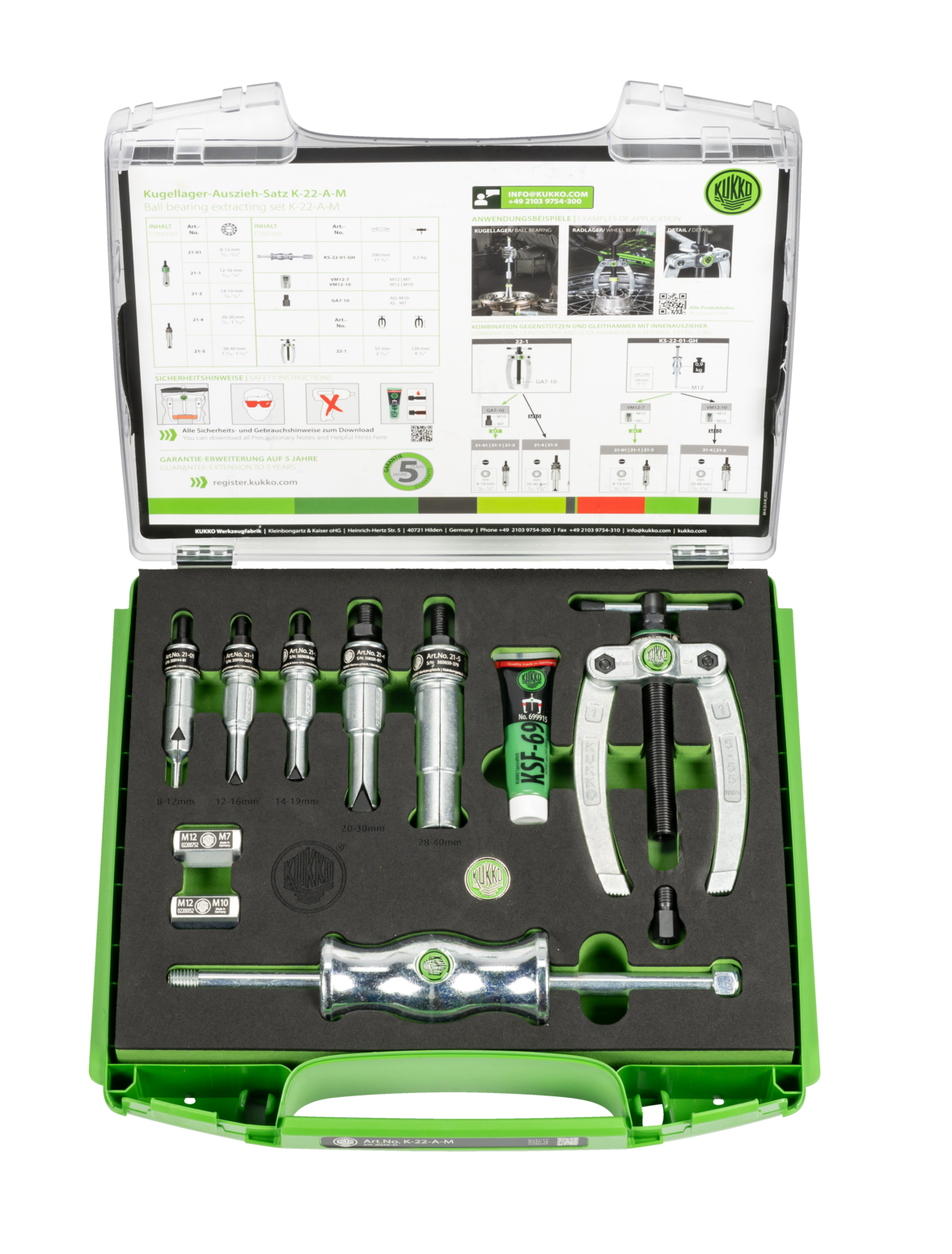 Serien K-22 används för borttagning av inre lager, yttre lagerringar och bussningar inom hantverk, verkstad och industri. Med en spännvidd från 8 till 40 mm är de fem olika inre utdragarna speciellt anpassade för demontering av gängse lager, yttre lagerringar och bussningar inom fordonssektorn men är även universellt användbara. Den mångfaldiga utförandet av de inre utdragarna med sina extra stora grepp tillåter säker utdragning av inre delar. Mothåll och slaghammar medföljer.