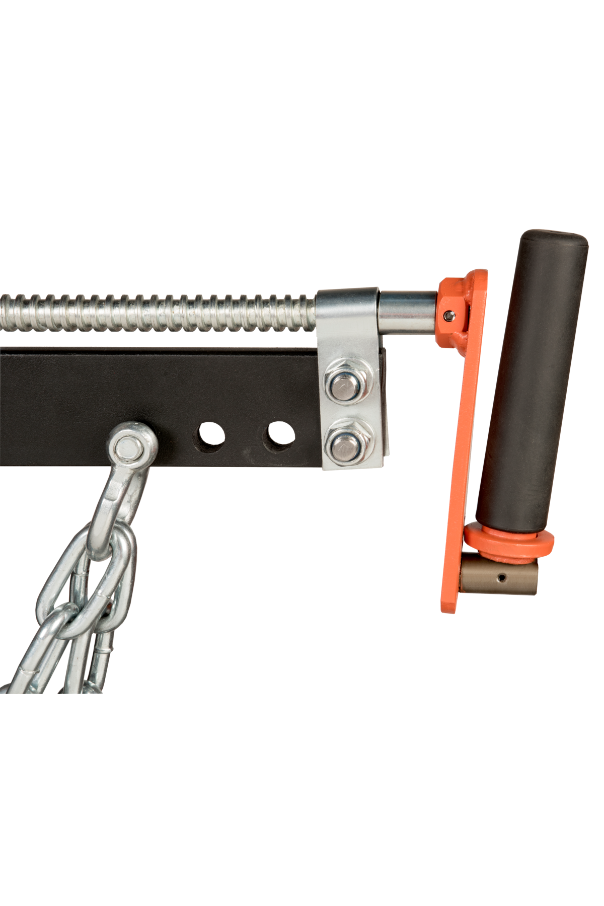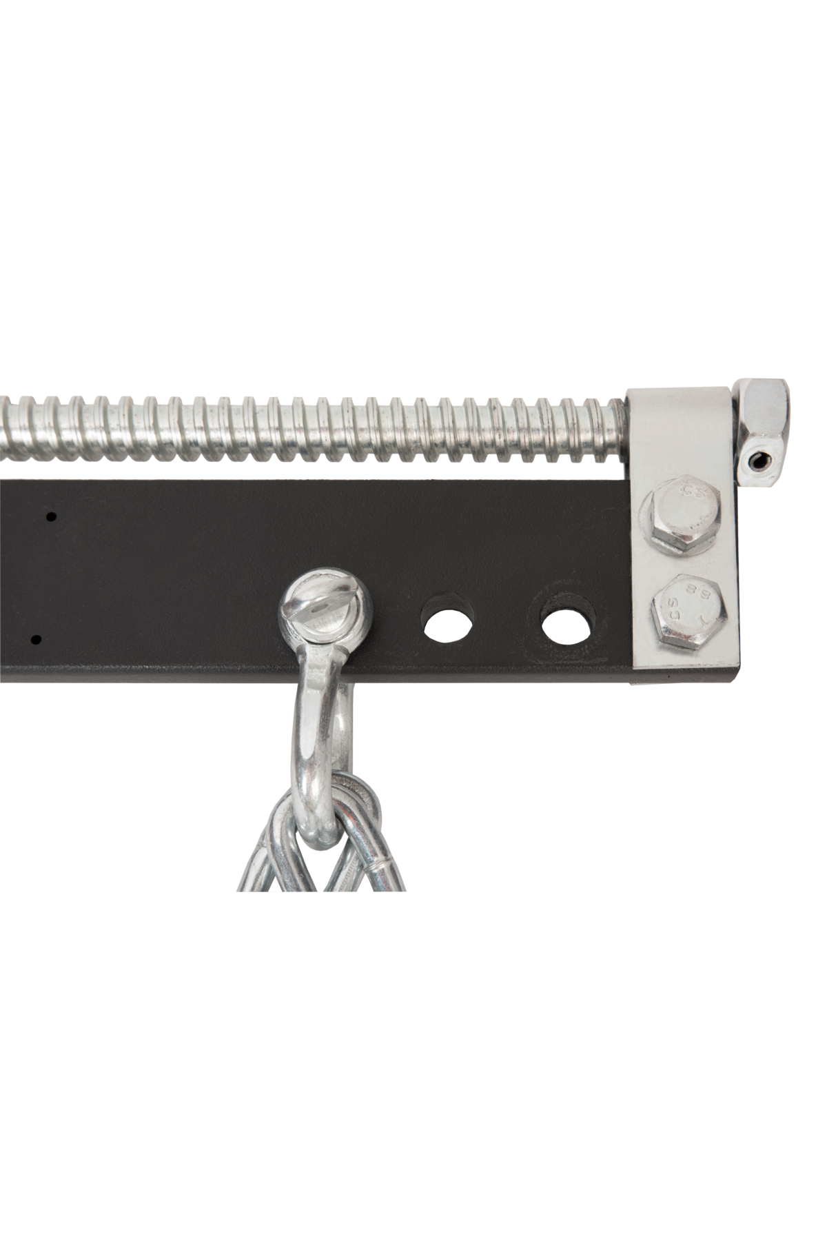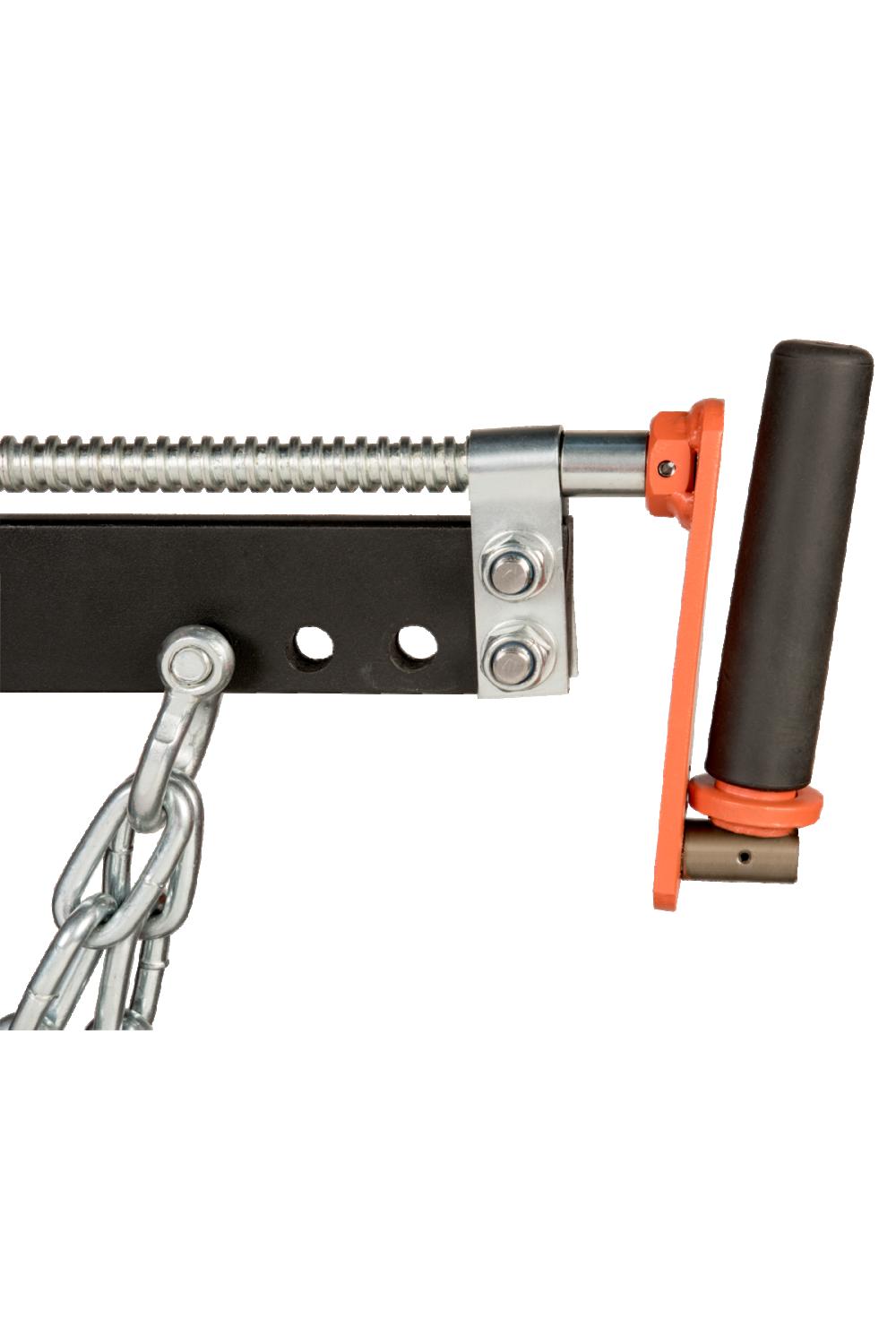 Kraftig svetsad kedja (Ø7,5 mm) och solida monteringsplattor.