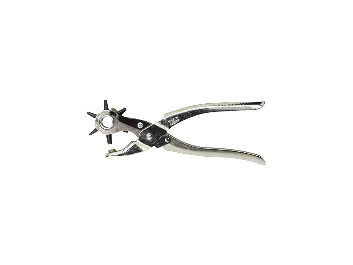 Förnicklad håltång i specialstål med roterande stanshjul – stansar snabbt och exakt hål i läder, gummi, plast och tyg.
