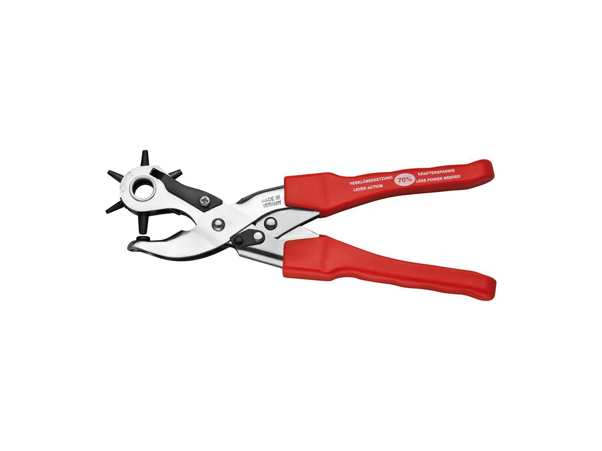 Kraftfull håltång i specialstål med roterande stanshjul och ergonomiskt grepp – stansar enkelt rena hål i läder, gummi och tyg med minimal kraft.