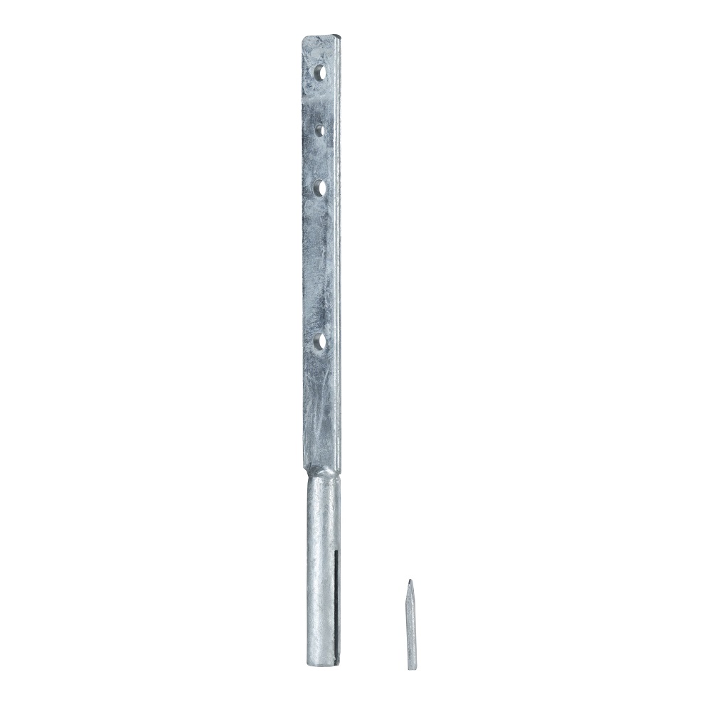 Stolpjärn med kil i varmförzinkad stålplåt. Kilen får stolpjärnet att expandera i botten så att det kläms fast i hålet.