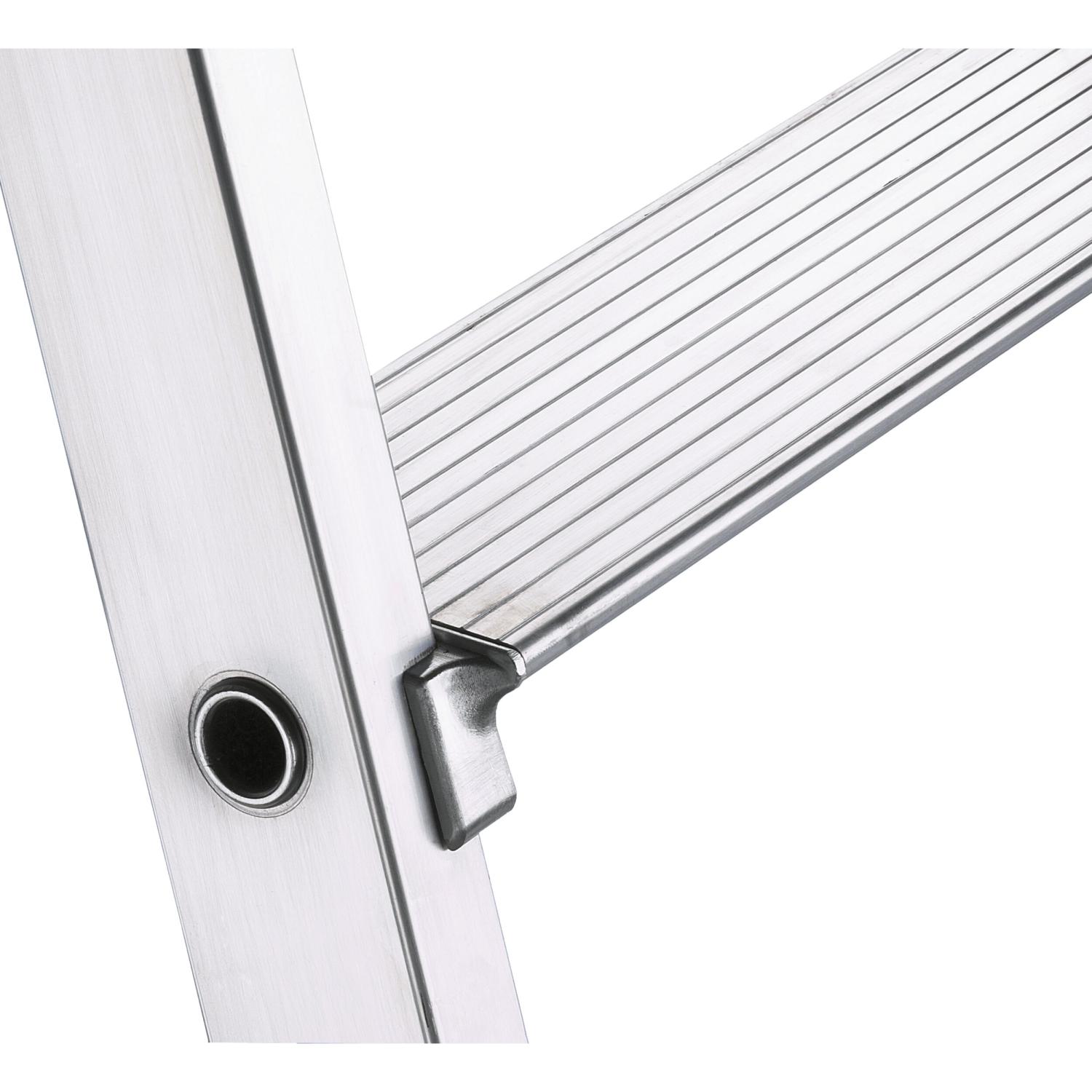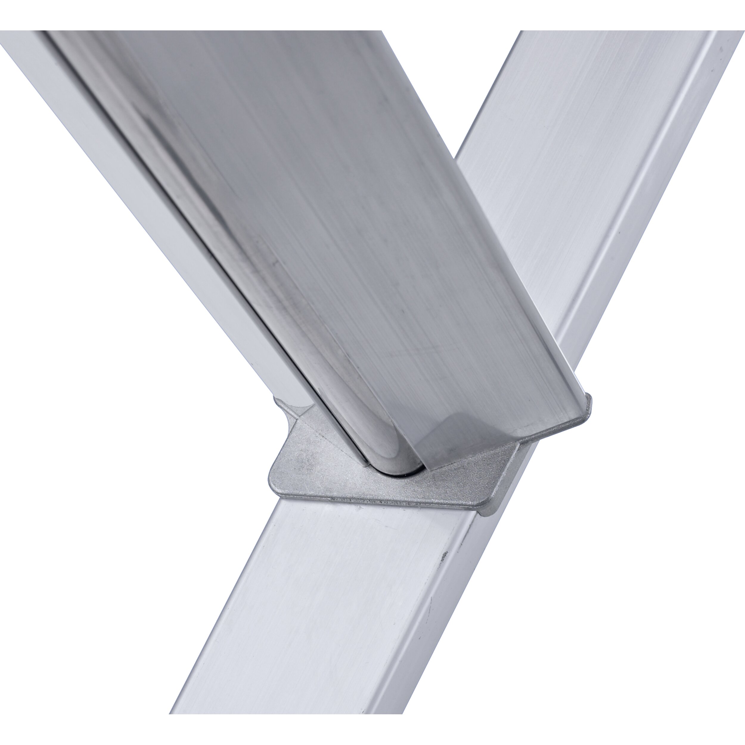 Två beslag på plattformen av strängpressad aluminiumprofil låser stegen i utfällt läge