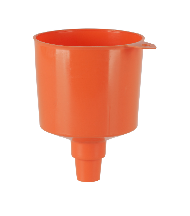 En 1-liters rund oljeflaska kan hällas direkt i tratten.