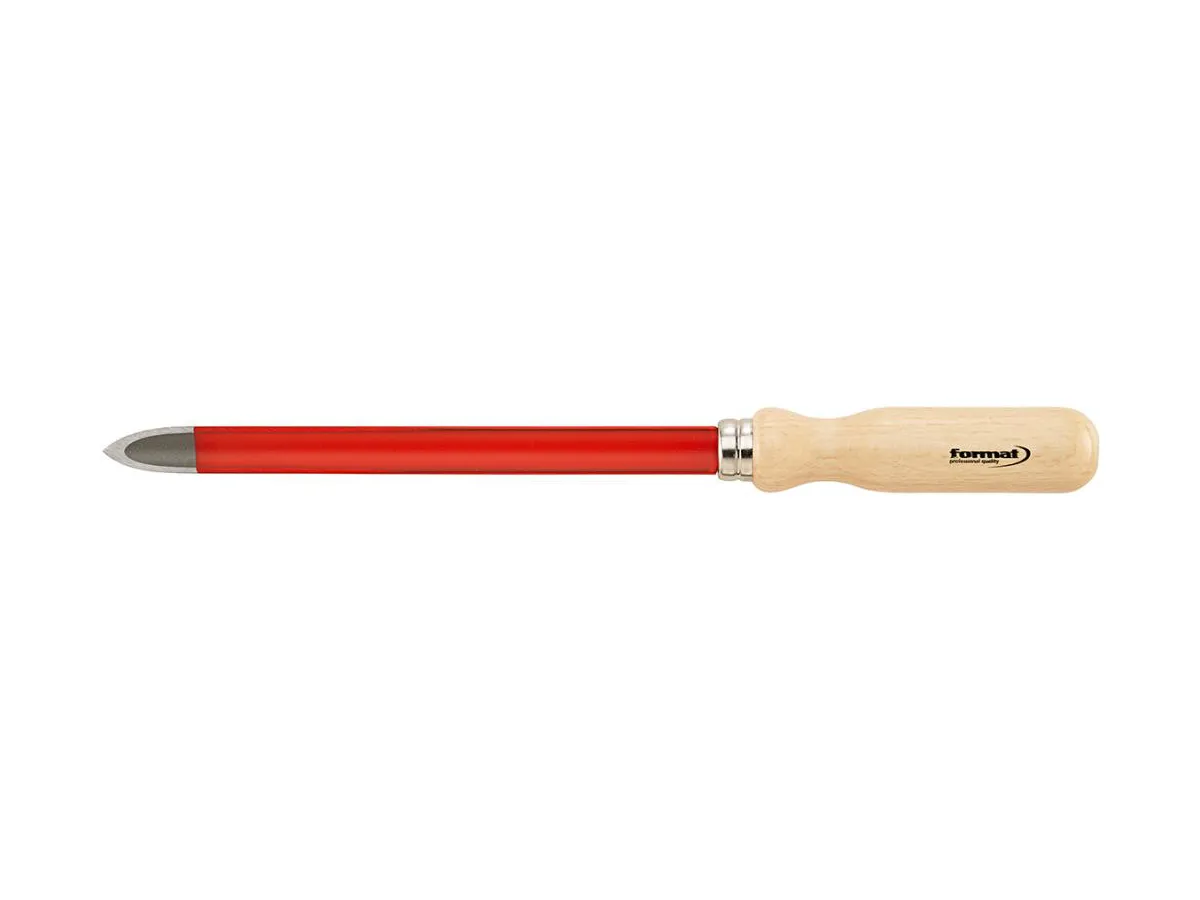 Skavstål trekantsformad.DIN 8350 C. Tillverkad av specialkrom stål, med triangulärt ihåligt profilblad med konkavt snitt och en ren emalj finish. Högsta skärningsförmåga tack vare hög bladhårdhet från 58-65 HRC till 1/3 av bladlängden. Med trähandtag i krökt form, målade och pressade in, sömlös stålrörklämma. Bladbredd: 16 mm Bladlängd: 200 mm