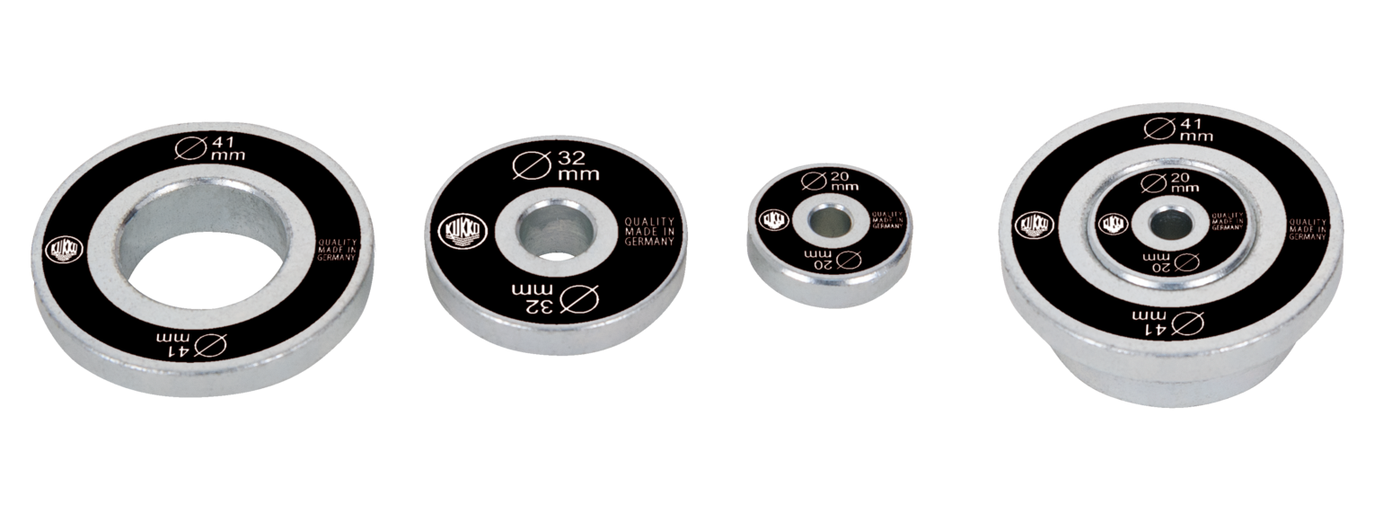 Tryckstyckssatsen används för att stabilisera tryckspindeln på en hålaxel. Satsen innehåller totalt tre tryckstycken som har olika diametrar och kan kombineras med varandra. Tack vare sin stegformade silhuett passar tryckstyckena perfekt på hålaxeln. Beroende på storlek kan de olika tryckstyckena även nästlas ihop för att uppnå axelns exakta diameter.